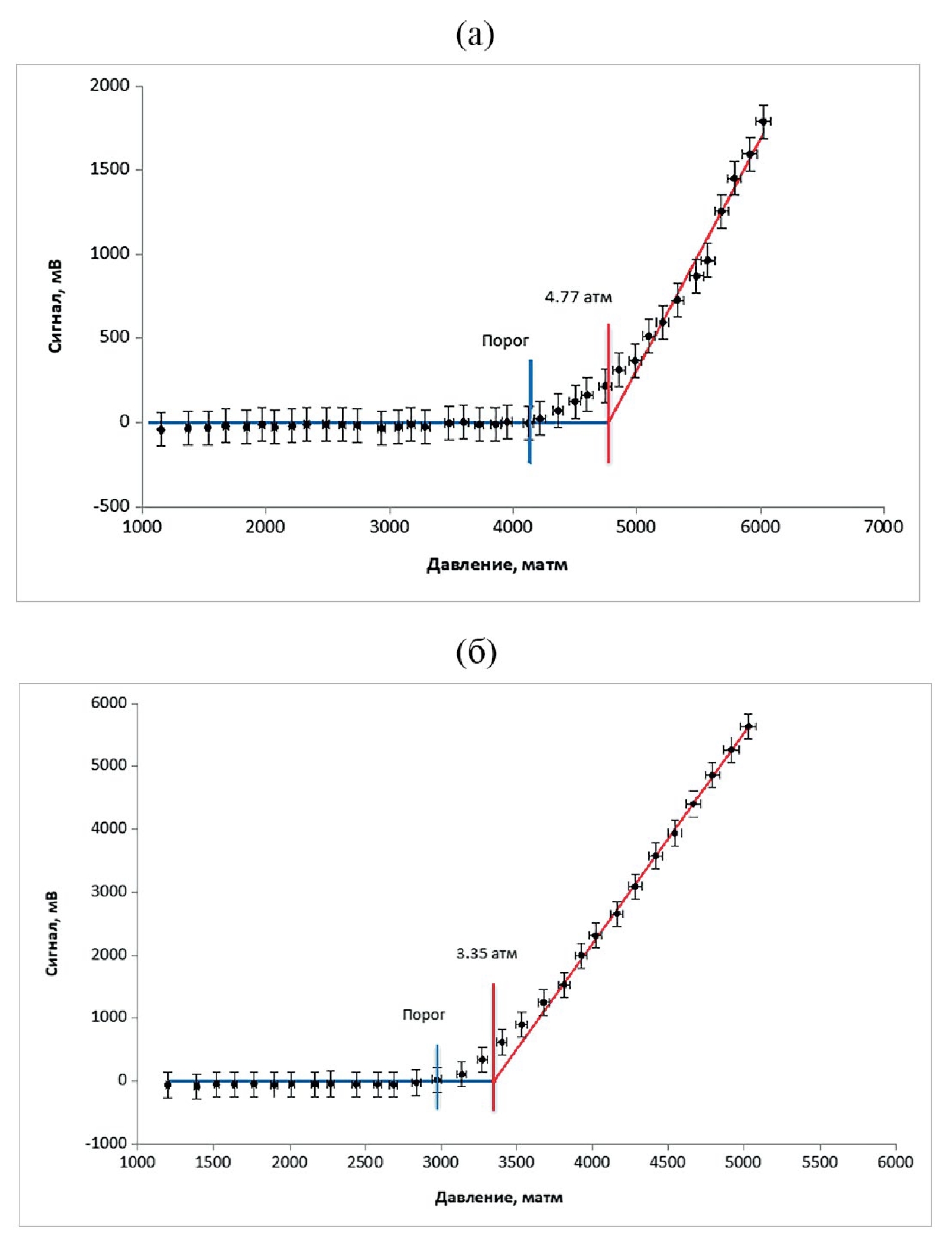 Рис. 6. Результаты измерения зависимости величины сигнала с фотодиода от давления для двух уровней ускоряющего поля: а соответствует меньшей энергии, б – большей.