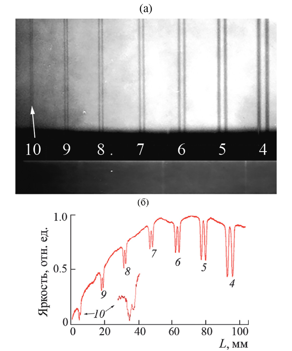 На рис. 3а приведены увеличенное (К = 4) изображение части эталона Duplex IQI с 10-й–4-й парами проволок (10–4), а на рис. 3б – денситограмма изображений этих пар, которая была измерена вдоль линии, перпендикулярной изображениям пар проволок. Эталон был установлен горизонтально в пучке тормозного излучения на сборке из четырех стальных параллелепипедов (9×9×50 мм3) с зазорами шириной 10 мкм между ними. На просветленном участке изображения сборки видны изображения зазоров между ее частями.