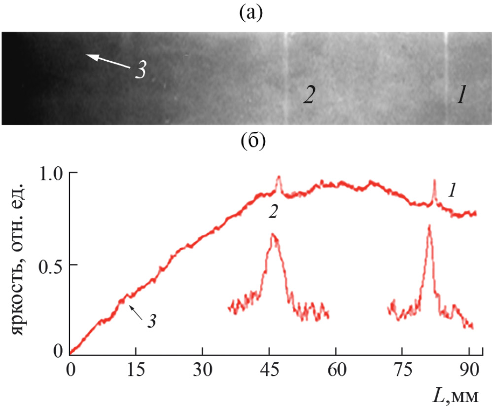 На рис. 7а приведено изображение стальной сборки с зазорами (1–3) между ее частями шириной 10 мкм и длиной вдоль пучка излучения 9 мм. Денситограмма, измеренная вдоль линии, перпендикулярной изображениям зазоров, представлена на рис. 7б. Стальная сборка была установлена в конусе излучения так, что зазоры 1, 2, 3 были расположены под углами θγ = 0.74°, – 0.74°, – 2.22° соответственно к оси пучка излучения. Из денситограммы следует, что ширина максимумов 1, 2, соответствующих зазорам 1, 2 на половине их высоты, составляет ΔSG ≈ 0.6, 1.1 мм. Для зазора 3 денситограмма демонстрирует двойной слабоинтенсивный максимум 3 с расстоянием между максимумами около 1.5 мм. Возможная величина геометрического размытия изображений зазоров составляет ∆a1 = 0.63 мм, если взять FG = 0.21 мм для зазоров, которые расположены вблизи центра углового распределения излучения. Эта величина близка к наблюдаемой ширине ΔSG1 максимума 1 денситограммы, которая гораздо меньше величины наблюдаемого размытия ΔSG2 максимума 2 денситограммы. Ясно, что такое различие определяется вкладом в ΔSG2 дополнительной геометрической нерезкости ∆a2 из-за наклона протяженного (около 9 мм вдоль пучка излучения) зазора 2 относительно направления излучения.