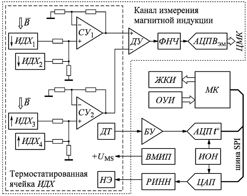 Рис. 1. Структурная схема канала измерения магнитной индукции электромагнита: ИДХ – интегральный датчик Холла, СУ – суммирующий усилитель, ДУ – дифференциальный усилитель, ФНЧ – фильтр нижних частот, АЦП Bэм – аналого-цифровой преобразователь измерения индукции электромагнита, ЦМК – центральный микроконтроллер канала регулирования и стабилизации индукции магнитного поля масс-анализатора, ЖКИ – жидкокристаллический индикатор, ОУИ – органы управления и индикации, МК – микроконтроллер, ДТ – датчик температуры, БУ – буферный усилитель, АЦП t˚ – аналого-цифровой преобразователь измерения температуры ячейки ИДХ, ИОН – источник опорного напряжения, ВМИП – высокостабильный малошумящий источник питания, РИНН – регулируемый источник напряжения нагрева, НЭ – нагревательный элемент, ЦАП – цифро-аналоговый преобразователь.