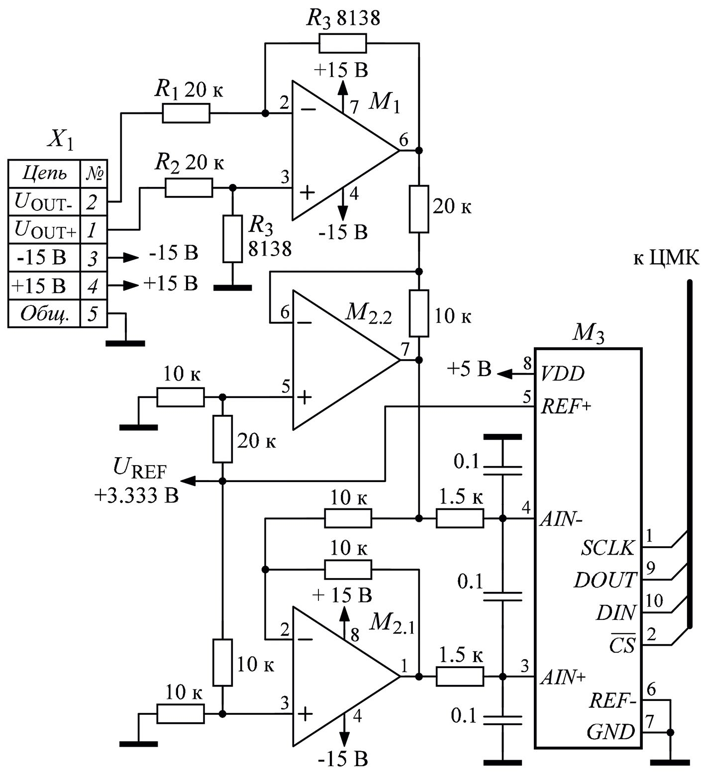 В качестве M3 в схеме используется микросхема AD7791 24-разрядного сигма-дельта АЦП с дифференциальным входом и встроенным задающим генератором [9]. Диапазон входного дифференциального напряжения АЦП 0±3.333 В определяется уровнем +3.333 В опорного напряжения, формируемого прецизионным термостатированным источником [1]. При изменении выходного напряжения усилителя M1 в диапазоне от -3.333 до +3.333 В противофазные напряжения на дифференциальных входах “AIN+” и “AIN-” АЦП должны составлять 0–3.333 В и 3.333–0 В соответственно. Для согласования диапазонов используется буферный каскад [10], выполненный на операционных усилителях M2.1 и M2.2.