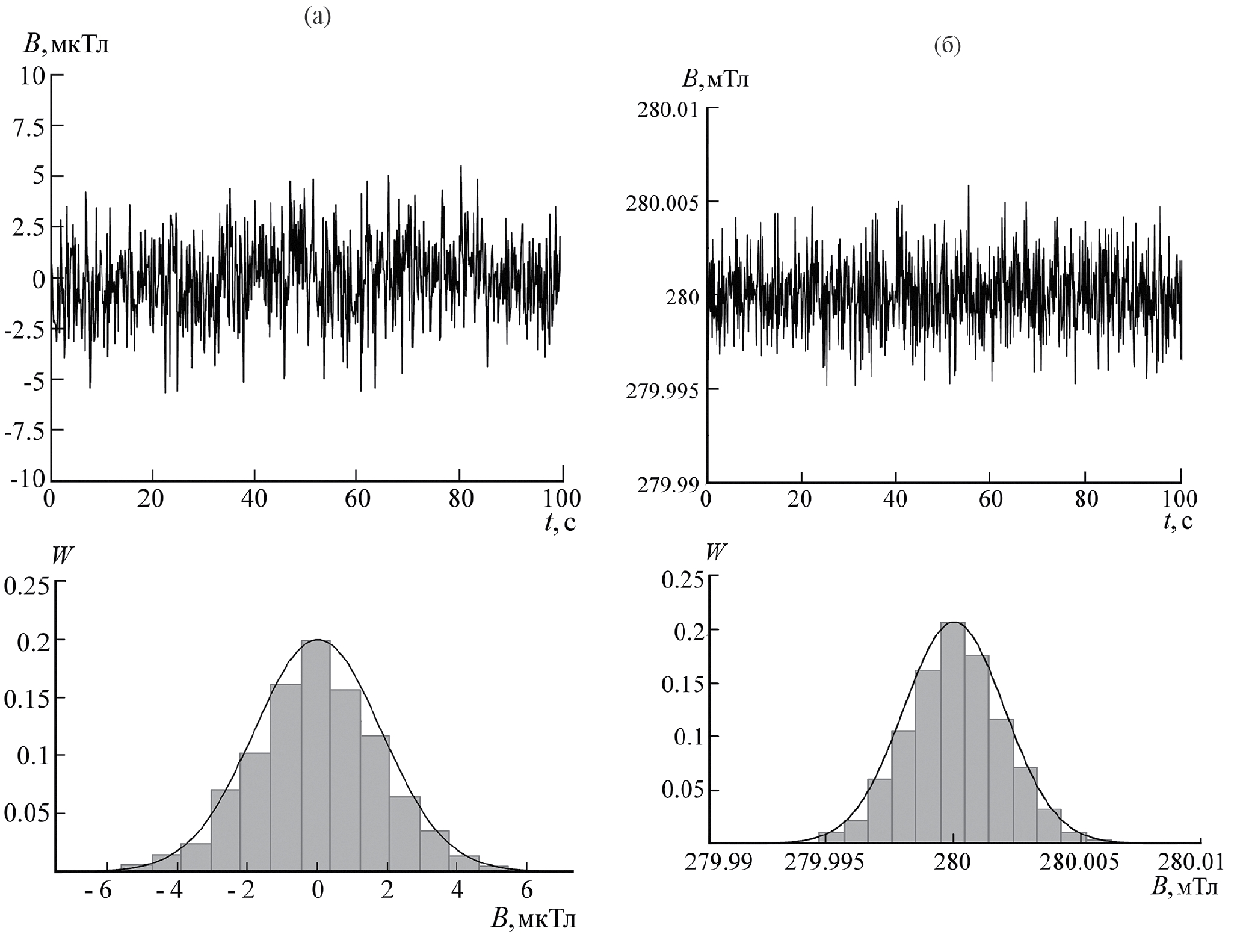Для исследования шумовых характеристик канала были выполнены измерения индукции при отсутствии внешнего магнитного поля (Bэм = 0) и при измерении поля электромагнита с индукцией Bэм = 280 мТл. Были сделано несколько временных выборок длительностью 100 с частотой дискретизации 10 Гц, что с учетом граничной частоты цифрового фильтра АЦП (M3 на рис. 4) соответствует измерению в частотном диапазоне 0.01–4 Гц. Анализ временных зависимостей B(t) и гистограмм распределения амплитуды флуктуаций магнитного поля, построенных по временным выборкам (примеры приведены на рис. 7), показывает отсутствие тенденций к появлению смещения среднего значения флуктуаций индукции на измерительном интервале. Полученные гистограммы соответствуют нормальному закону распределения, характеризующему стационарный стохастический процесс – тепловой шум холловской ячейки. Размах флуктуаций индукции амплитудой 6.6σ составляет 12–13 мкТл в зависимости от выборки.