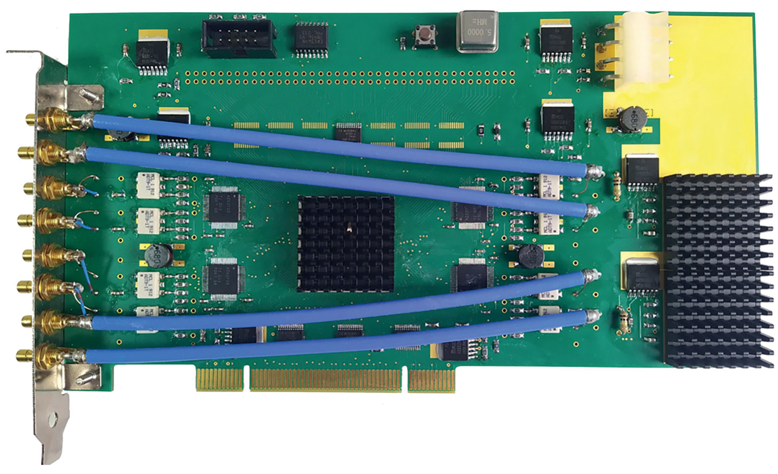Для подачи сигналов в модуль используются малогабаритные высокочастотные разъемы типа В, установленные на планку базовых модулей в шахматном порядке. На печатной плате расположены 4 спаренных аналого-цифровых преобразователя (АЦП), программируемые логические интегральные схемы (ПЛИС) с радиатором для отвода тепла, дополнительные радиаторы и другие электронные компоненты. Для улучшения чувствительности регистратора на печатной плате установлены высокочастотные повышающие трансформаторы ADT9-1T+. Это позволило переместить рабочий диапазон входных напряжений в область 0.12–500 мВ. При такой величине нижнего значения диапазона входного сигнала необходимо было минимизировать ухудшение чувствительности, вызванное проникновением сигнала от работы цифровой части базовых модулей во входные аналоговые схемы. Это было достигнуто благодаря использованию индивидуальных для каждого АЦП источников питания с фильтрацией, необходимых для аналоговой части питающих напряжений. Также немаловажную роль играет и использование специальных областей слоев печатной платы для организации заземления и экранирования АЦП. Печатная плата состоит из 6 слоев, в верхнем и нижнем слоях предусматриваются места для установки дополнительных радиаторов.