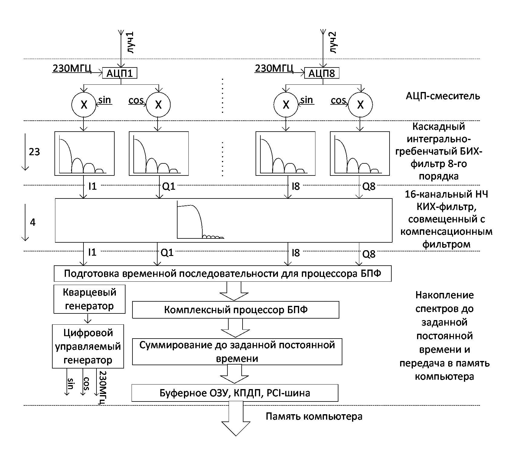 Для дискретизации сигналов используется метод прямой оцифровки [2−4], при котором оцифровывается весь входной сигнал, включая как полезный сигнал рабочей полосы, так и сигнал, лежащий вне ее (рис. 2). Это позволяет в дополнение к аналоговой фильтрации, проводящейся до АЦП, улучшить подавление помех и шумов вне рабочей полосы. Уровень подавления частот за пределами рабочей полосы составляет не менее 60 дБ. Неравномерность амплитудно-частотной характеристики (АЧХ) в полосе пропускания определяется в основном характеристиками трансформатора и составляет 0.06 дБ. Оцифровка производится на восьми 12-битных АЦП с частотой 230 МГц. Максимальная частота дискретизации АЦП (ADS62P29) составляет 250 МГц. На элементах ПЛИС создан модуль опорных частот, на котором формируется набор тактовых частот, необходимых для всего процесса обработки сигналов. Кроме того, реализован цифровой управляемый наблюдательной программой генератор сигналов (sin, cos), необходимых для квадратурного преобразования частоты (Inphase/Quadrature, IQ-преобразователи). В стандартных наблюдениях частоты этих сигналов составляют 110.25 МГц. В случае необходимости имеется возможность изменять их частоту, тем самым смещая рабочую полосу регистрации в спектре входного сигнала. Каждый из входных сигналов перемножается с синусоидальным и косинусоидальным сигналами гетеродина (на схеме уровень смесителей), и получаемые 16 сигналов (по 2 для каждого входного сигнала) отправляются на этап фильтрации. Первая фильтрация выполняется на каскадных интегрально-гребенчатых CIC-фильтрах (cascaded integrator-comb) с бесконечной импульсной характеристикой (БИХ), представляющих собой каскадное соединение сумматоров и дифференциаторов. Эти операции не используют операций умножения, и поэтому для них не требуются значительные ресурсы ПЛИС. Операции в смесителях и CIC-фильтрах выполняются параллельно с частотой дискретизации 230 МГц, по этой причине ресурсы, выделяемые для них, должны быть минимизированы. Описанная выше методика позволяет оптимизировать выделяемые ресурсы и в том числе уменьшить тепловыделение, снизить требования к отводу тепла от ПЛИС. После первого этапа фильтрации частота в потоках данных (а их получается 16) снижается в 23 раза до 10 МГц. Это позволяет применить обработку с помощью блоков, требующих значительно большее количество ресурсов, если использовать раздельно по времени ресурсы одного и того же блока для нескольких потоков данных.