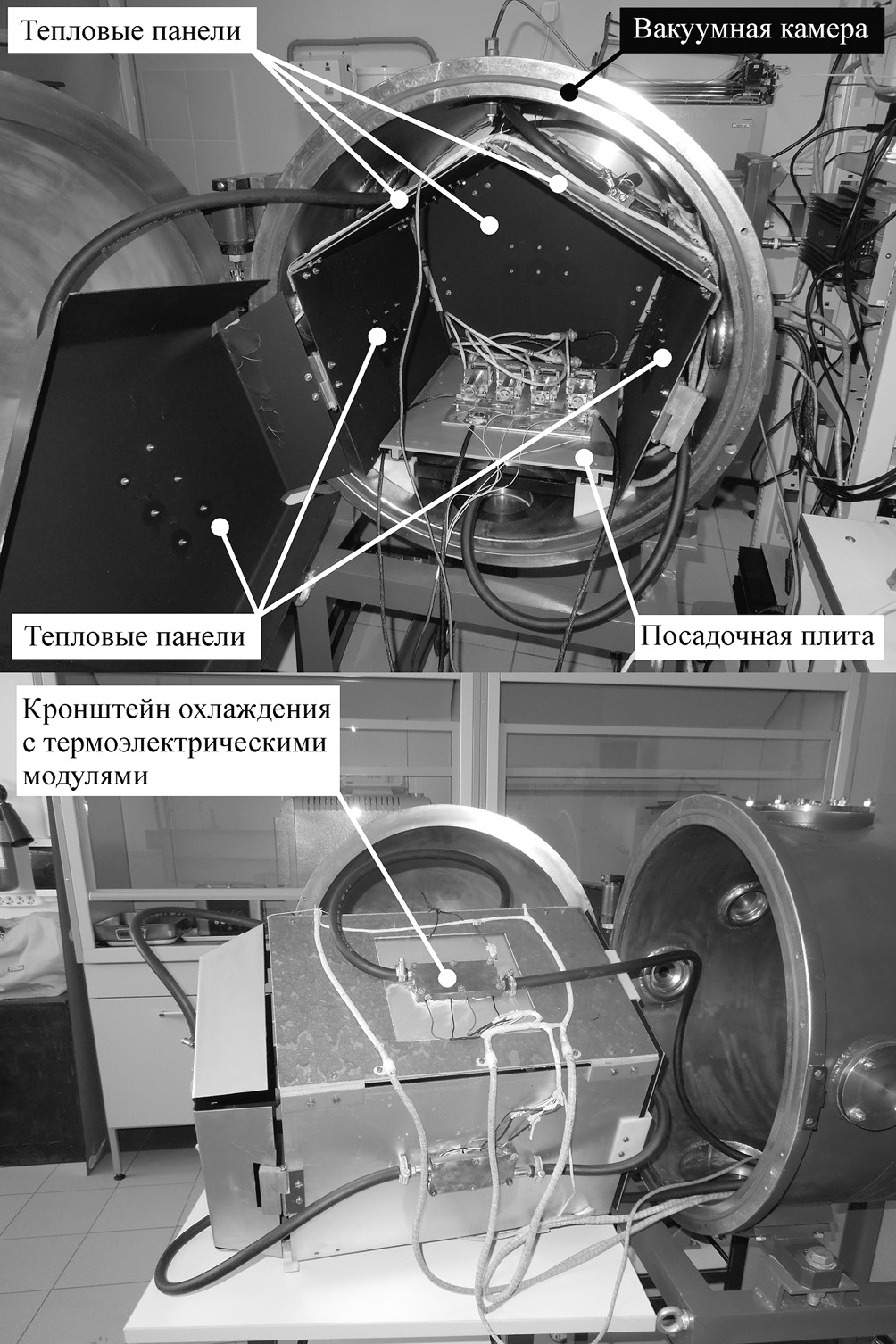 На каждой тепловой панели и на посадочной плите установлены по два термоэлектрических модуля, прижимаемых к панелям и плите медными кронштейнами, поглощающими тепловой поток от тепловыделяющих поверхностей термоэлектрических модулей. Теплоотвод от этих кронштейнов осуществлялся посредством проходящей через них проточной воды, подводимой через последовательно соединенные шланги и гермовводы в стенке вакуумной камеры. Такая система позволяет охлаждать панели и плиту до температуры около −30 ˚С.