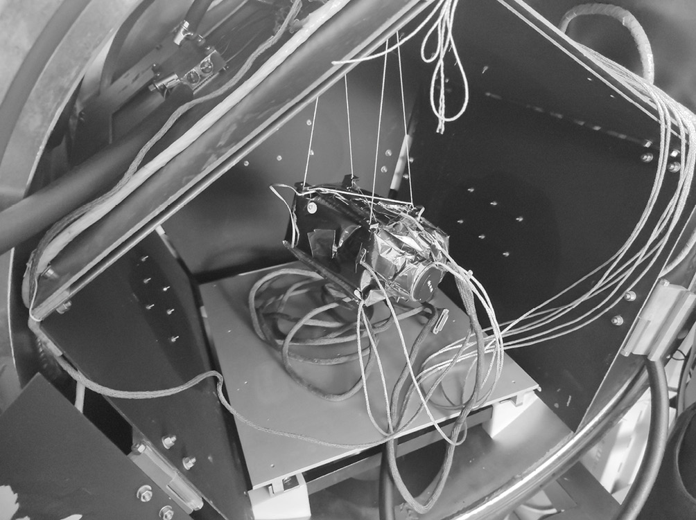 Качественно эксперимент состоял в следующем. Объект исследования (прибор с установленными теплоизоляцией и датчиками температуры) помещался на малотеплопроводном подвесе внутри экспериментальной установки (рис. 3).