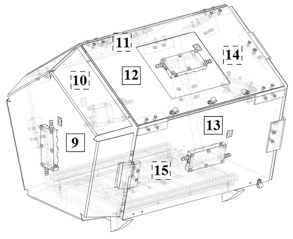 Номера температурных датчиков, установленных на охлаждаемых панелях имитатора тепловых потоков, находятся в диапазоне с 9 по 15 (рис. 5) в соответствии со сквозной нумерацией всех датчиков, используемых в эксперименте.