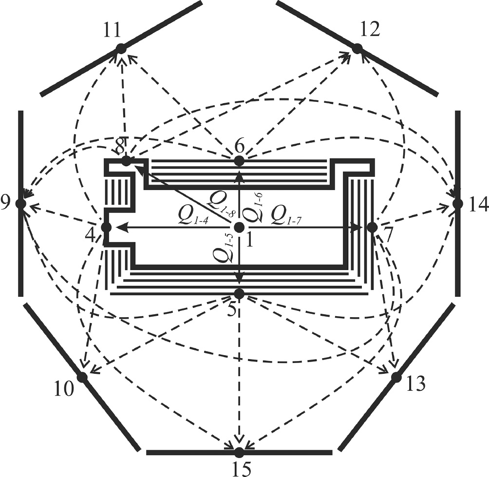 Для обработки экспериментальных данных необходимо определить доли от генерируемого внутри прибора теплового потока (Q1 = 1.5 Вт), которые идут через нижний (Q2-5) и верхний (Q3-6) фрагменты ЭВТИ.