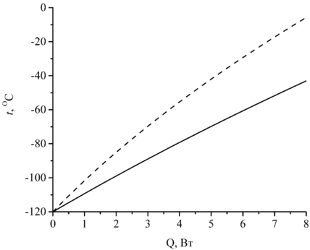 Рис. 8. Зависимости температуры прибора от мощности нагрева на поверхности Марса: прибор крепится непосредственно к конструкции марсохода (сплошная кривая), прибор крепится к марсоходу через тепловые развязки с тепловым сопротивлением 80 К/Вт (штриховая кривая).