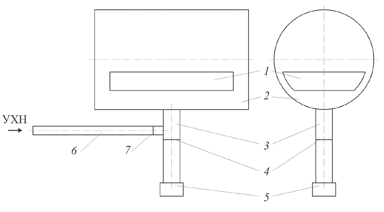 Рис. 1. Расчетная схема экспериментальной установки: 1 – ловушка УХН, 2 – вакуумный объем, 3 – нейтроновод выпуска УХН из ловушки, 4 – затвор нейтроновода выпуска УХН, 5 – детектор УХН, 6 – нейтроновод наполнения ловушки ультрахолодными нейтронами, 7 – затвор нейтроновода наполнения УХН.