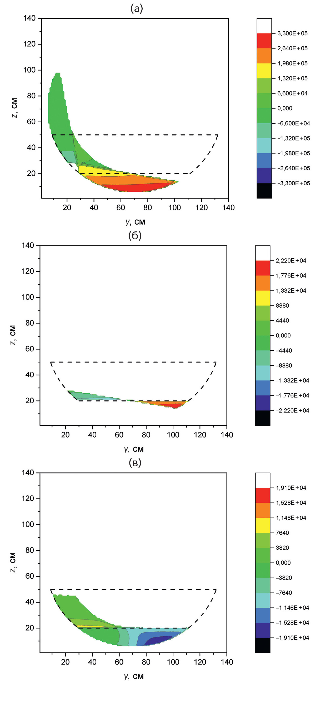 Рис. 4. Относительное изменение энергии УХН в зависимости от места соударения для следующих процессов: а – захват до начала мониторирования, б – захват после окончания мониторирования, в – выпуск на детектор после удержания. Штриховой линией показано положение ловушки в горизонтальном положении (θtrap = 0). Разный масштаб шкал определен разным количеством соударений УХН со стенками на разных этапах эксперимента.