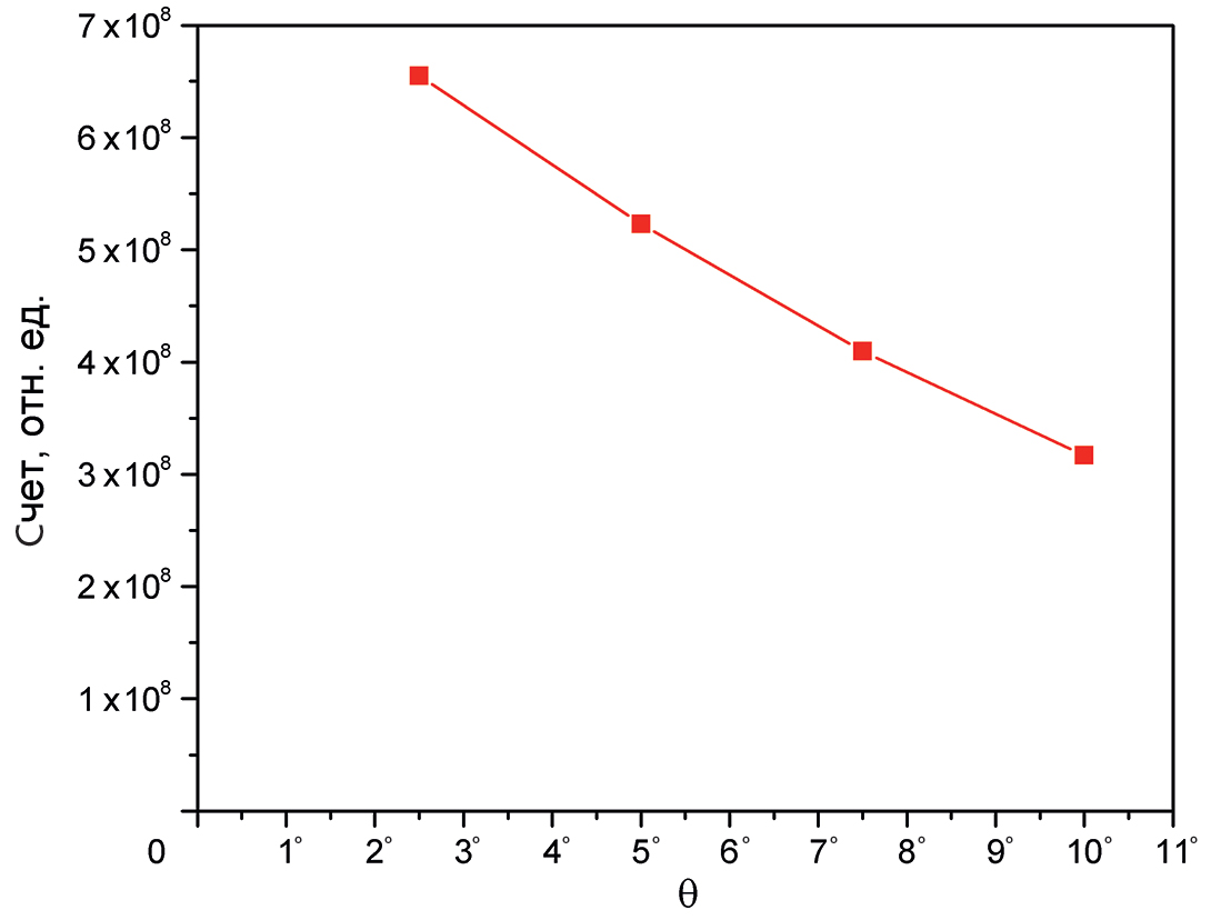 Из спектров на рис. 5 следует, что с увеличением угла мониторирования существенно падает количество нейтронов в сливе, что ухудшает статистическую точность измерений. Зависимость количества нейтронов в сливе после короткого удержания от угла мониторирования показана на рис. 6. При изменении угла мониторирования от 2.5° до 10° количество нейтронов в сливе падает в 2 раза.