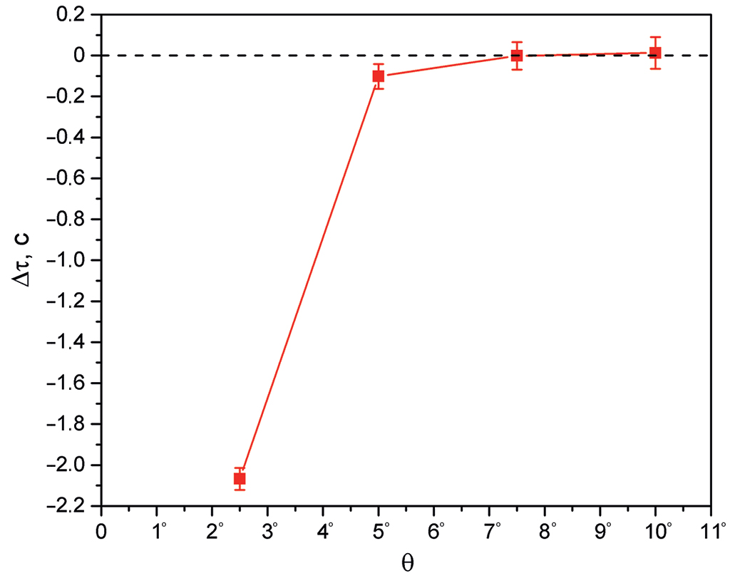 Рис. 7. Зависимость поправки к результату измерения времени жизни нейтрона от угла мониторирования. Время поворота ловушки на 180° составляет 90 с.