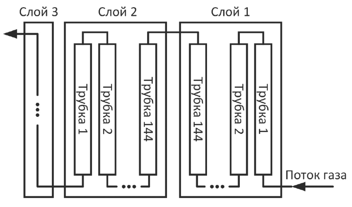Все трубки в каждом слое камеры соединены в последовательные цепочки (рис. 5) при помощи газовых перемычек, последняя трубка крайнего слоя камеры соединяется латунными трубками диаметром 2 мм с общим газовым коллектором, который, в свою очередь, соединен с газовым редуктором, регулирующим подачу газа. Камеры соединены с газовым коллектором параллельно и заполнены газовой смесью Ar–CO2 в соотношении 93%–7% под избыточным давлением в 1 атм.