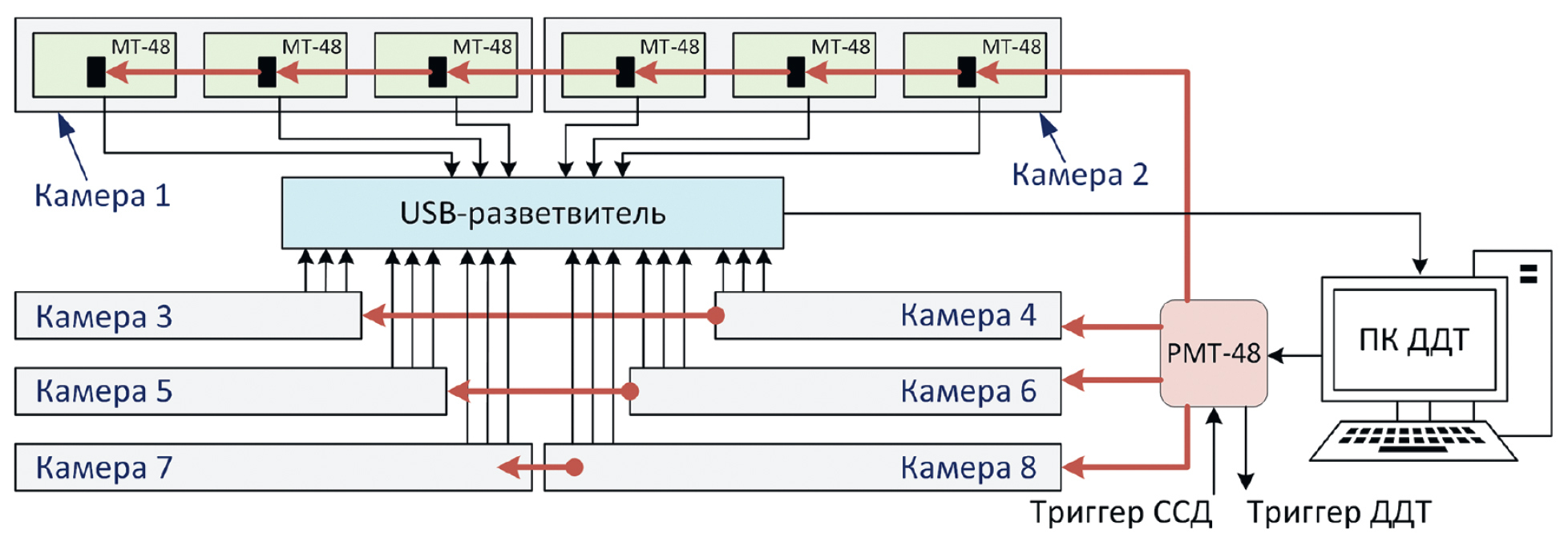 Структурная схема системы сбора данных ДДТ приведена на рис. 6. Она состоит из 24 плат считывания МТ-48, USB-концентратора, платы-разветвителя сигналов синхронизации РМТ-48 [26] и персонального компьютера. Главным элементом управления является компьютер с соответствующим программным обеспечением. На нем в определенной последовательности вырабатываются сигналы управления, которые через LPT-порт передаются блоку РМТ-48. От модуля РМТ-48 команды передаются на модуль МТ-48 через 4 кабеля, каждый из которых обслуживает 6 плат одной проекционной плоскости. Считывание информации с МТ-48 осуществляется через USB-интерфейсы, каждая плата подключается к компьютеру через USB-концентратор.