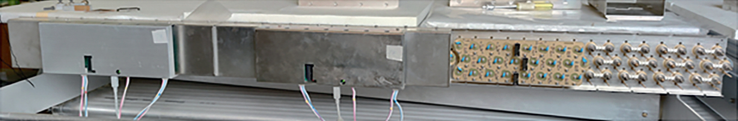Кроме плат системы регистрации, на каждой камере из дрейфовых трубок на противоположной стороне трубок устанавливаются платы высоковольтного питания через дополнительные токоограничивающие переходные платы с использованием специальных штырьковых контактов [26]. Для механической защиты и борьбы с наводками все платы заключены в металлические короба (рис. 7). К каждой плате МТ-48 подключено 5 кабелей: 2 для питания усилителей (±5 В), питание цифровой части платы (+5 В), USB-кабель и плоский кабель (шлейф), соединяющий все МТ-48 с платой РМТ-48. Напряжения питания ±5 В на платы МТ-48 подаются от малогабаритных источников питания DR-60-5 фирмы Mean Well. На высоковольтной стороне переходные платы соединяются специальными перемычками, высокое напряжение (порядка 3 кВ) подается на всю проекционную плоскость по одному кабелю.