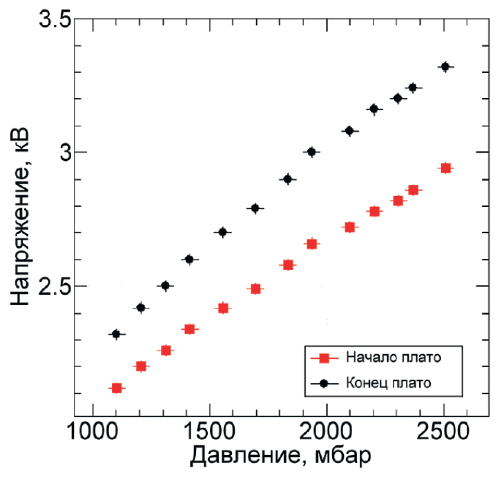 При определении рабочего напряжения камеры для каждой дрейфовой трубки измеряется счетная характеристика – зависимость скорости счета сигналов со всех трубок камеры от величины приложенного напряжения при естественном радиационном фоне. Пример такой зависимости приведен на рис. 8 для всех 144 трубок одной из камер. Измерения проводились при пороге усилителей 0.9 В с шагом изменения высокого напряжения 20 В и общим количеством циклов чтения-записи данных 1000 шт. На графиках хорошо видно плато счетной характеристики в диапазоне от 2.8 до 3.1 кВ с частотой около 40 Гц. Середина плато определяет рабочую точку для данной дрейфовой камеры. Положение данного плато зависит от давления газа, что было проверено на ряде измерений, усредненные результаты которых сведены в график на рис. 9, где показана зависимость напряжения начала и конца плато счетной характеристики в зависимости от давления рабочей смеси.