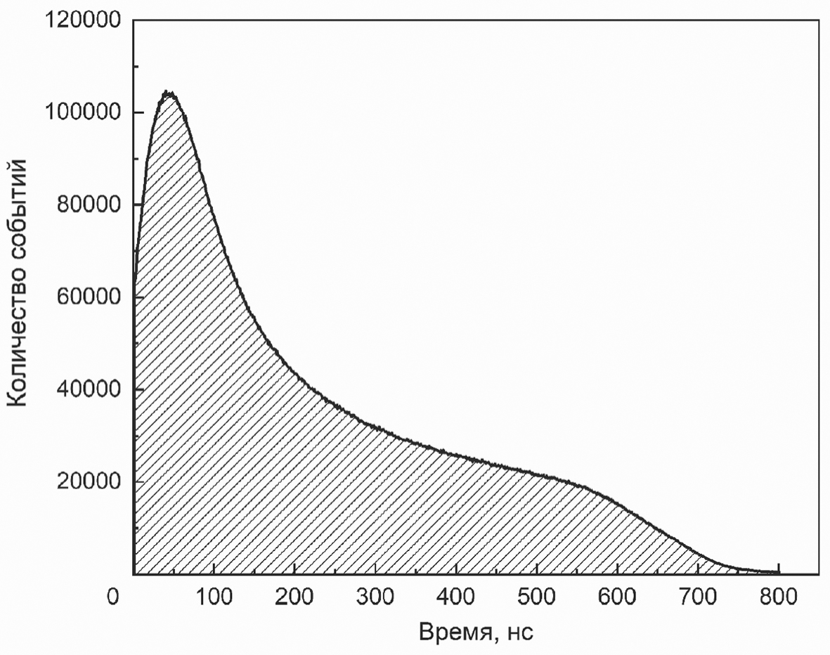 Выделение треков космических мюонов в ДДТ происходит с использованием метода пространственно-временной кластеризации сигналов. В зарегистрированных данных в течение каждого временного интервала 16.7 мс со всех камер отбираются кластеры совпадений сигналов не менее двух трубок в одной камере и не менее 11 трубок во всех камерах годоскопа в интервале 800 нс, который соответствует максимальному времени дрейфа в трубке. Приняв сигнал с минимальным временем в кластере за начало (стартовое время) измерения времени дрейфа, можно получить распределение времен дрейфа, показанное на рис. 10. Проинтегрировав данное распределение, получаем первое приближение для r(t)-соотношения (рис. 11). По величине максимального времени дрейфа можно судить об однородности и изменениях состава газовой смеси со временем [31].