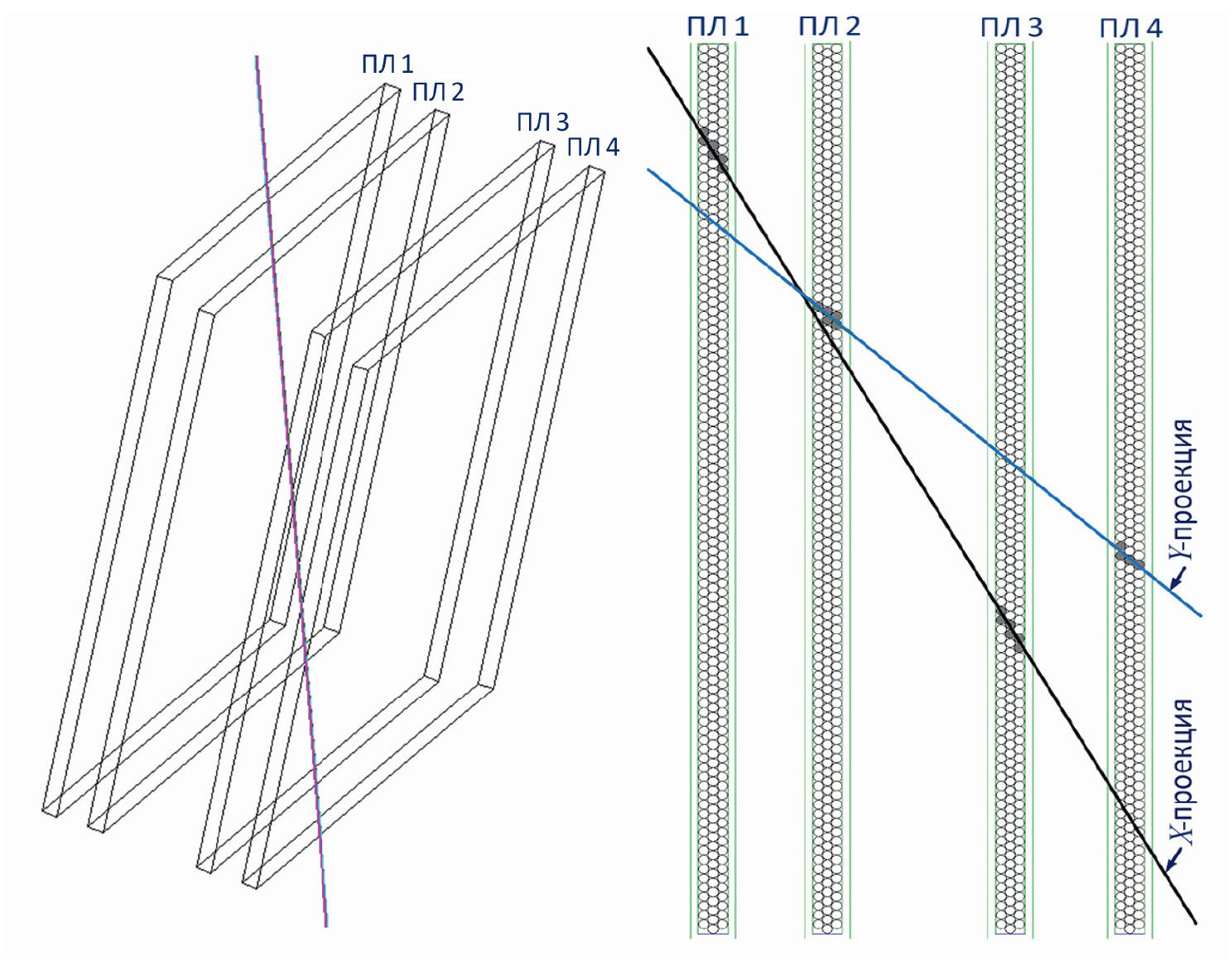 Рис. 12. Пример реконструированного трека частицы: ПЛ1 и ПЛ3 – горизонтальная проекция, ПЛ2 и ПЛ4 – вертикальная проекция.