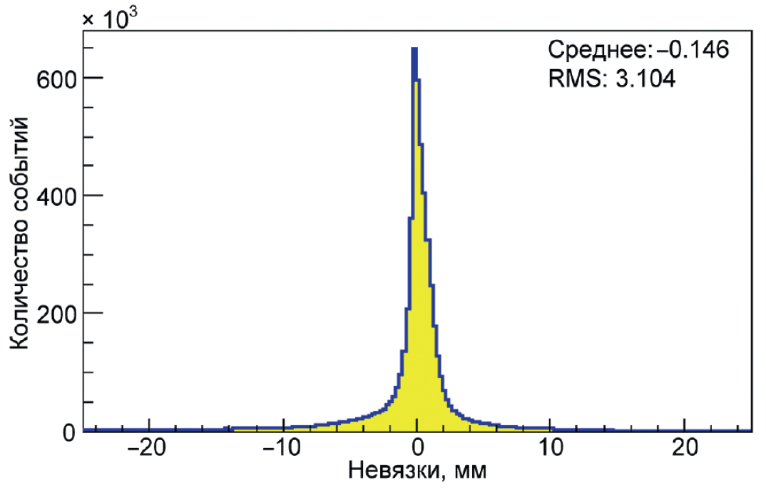 Оценка пространственной привязки треков проводится по полученным для трека суммарным распределениям разниц-невязок между положением трека и расстояниями до анодных нитей трубок, найденных по данным r(t)-зависимостей. На рис. 13 приведен пример углового распределения невязок (residuals): Res = Rfit,i − Rhit,i, где i = 0, …, n – трубки, участвующие в реконструкции трека; Rfit,i – расстояние от центра i-й трубки до прямой, определяющей трек, полученной в результате фитирования данных; Rhit,i – радиус окружности, полученной из измерения времени дрейфа для i-й трубки на основе r(t)-зависимостей.