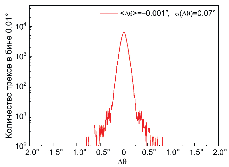 На рис. 13 видно, что точность определения точки на треке (невязки) по данным трубок по всем камерам имеет величину около 3 мм (FWHM). В эту величину также входят систематические неточности измерений координат геометрии установки, определенное количество материала на пути мюона (стенки трубок и рама) и наличие мюонов с малыми импульсами. На рис. 14 приведена оценка угловой погрешности по данным моделирования, откуда следует, что верхняя оценка угловой погрешности определения зенитного и азимутального углов составляет около ó ≈ 0.07°, что соответствует ошибке определения трека в пространстве óø = √—2‧—ó ≈ 0.1° (~2 мрад). Эта точность позволяет локализовать объект площадью 20 × 20 см2 на расстоянии до 50 м.
