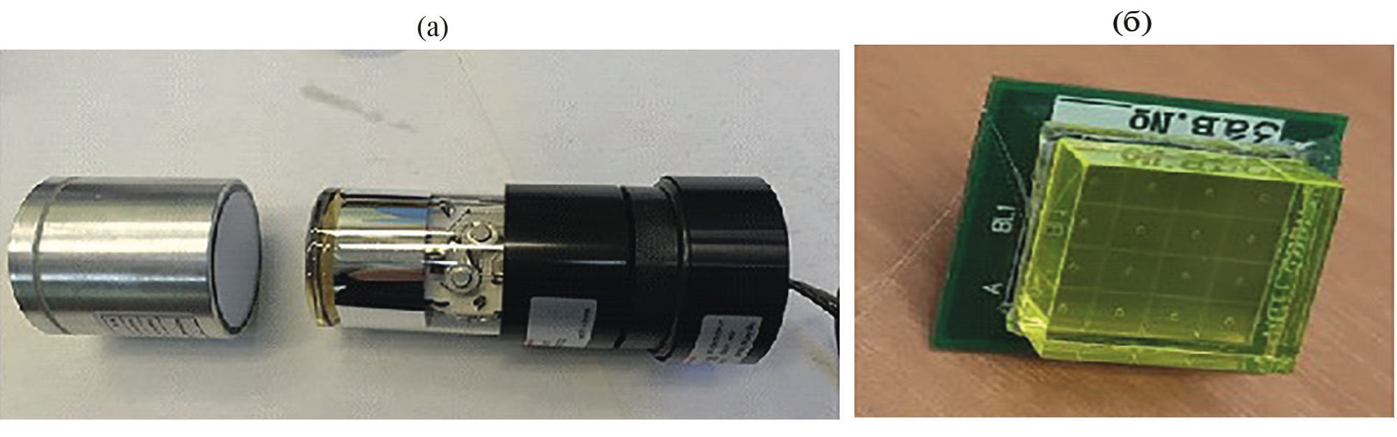 Рис. 2. Фото компонентов детектора рассеянных фотонов (а) и фото промежуточного рассеивателя из GAGG-сцинтиллятора и матрицы кремниевых фотоумножителей (б).