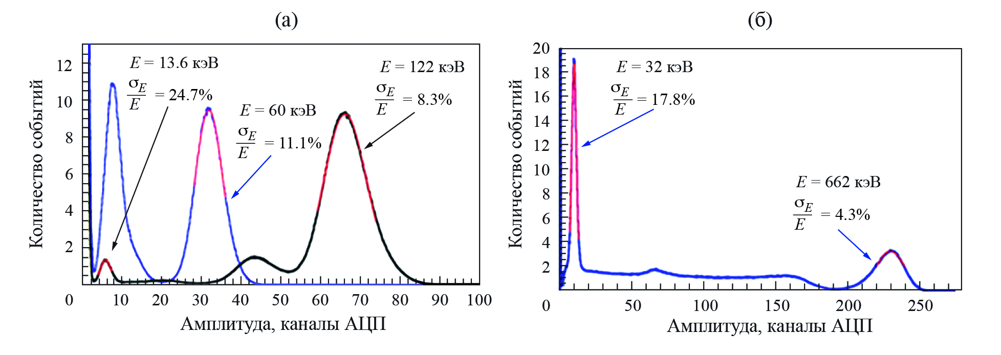 Рис. 5. Амплитудные спектры в промежуточном GAGG-рассеивателе, полученные при облучении детектора различными гамма-источниками: а – спектры для источников 241Am (синяя линия) и 57Co (черная линия), б – спектр для источника 137Cs.