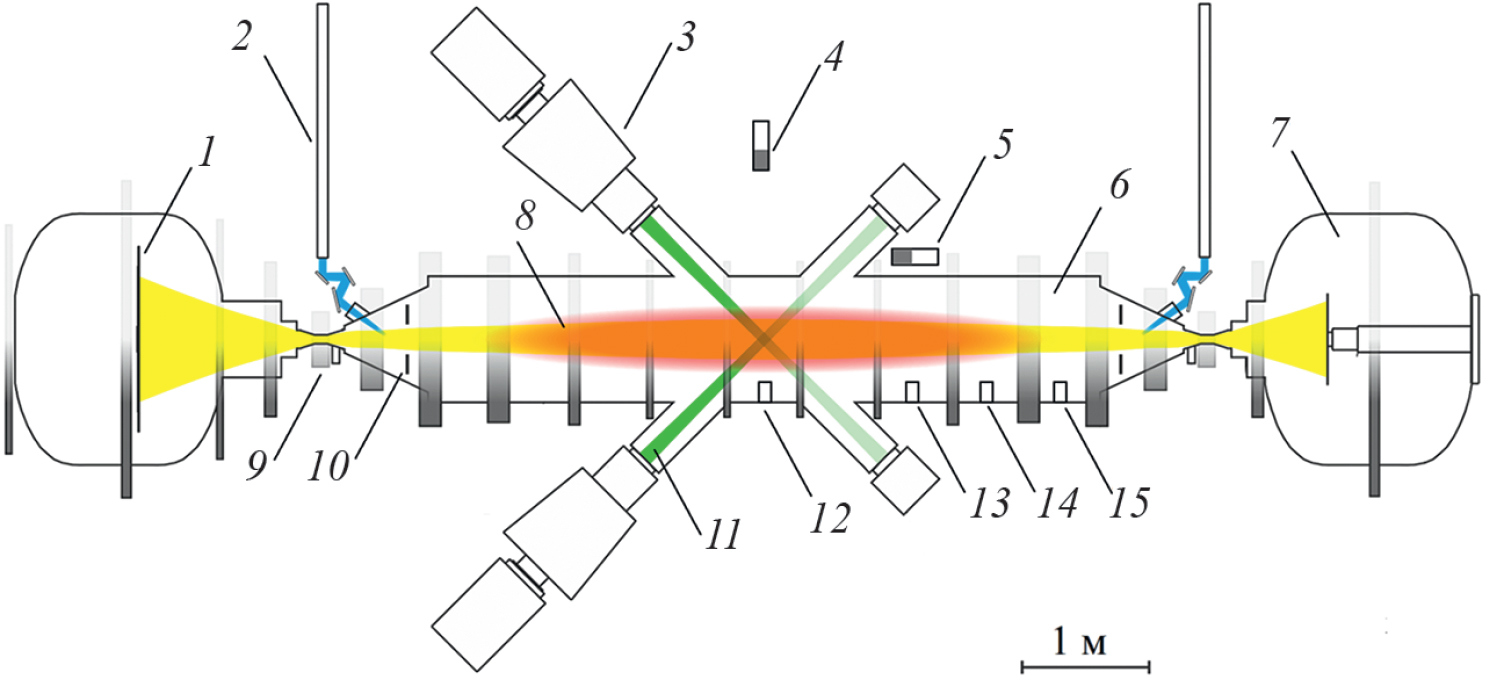 Рис. 1. Установка газодинамическая ловушка: 1 – приемник плазмы, 2 – волноводы системы СВЧ-нагрева плазмы, 3 – инжекторы нейтральных атомов, 4 – спектрометр нейтронов и гамма-квантов на основе стильбена, 5 – детектор на основе сцинтиллятора и ФЭУ, 6 – центральная ячейка ГДЛ, 7 – расширительный бак, 8 – быстрые ионы, 9 – катушка магнитной пробки, 10 – лимитер, 11 – пучки атомов дейтерия, 12–15 – детекторы термоядерных протонов на основе диодов.