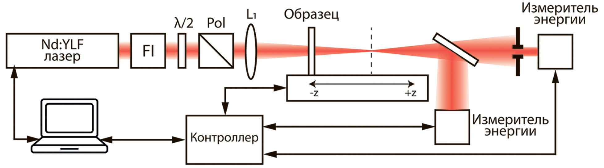 Исследование нелинейно-оптических свойств материалов имеет большое значение для многих областей науки и техники, включая телекоммуникации в виде оптических переключателей, модуляторов и электрооптических устройств [1−3], волноводов [4], некоторых биологических задач [5], а также при конструировании оптических схем для лазерной техники [6]. Нелинейный показатель преломления является фундаментальным оптическим свойством, характеризующим реакцию материала на свет большой интенсивности. Он играет решающую роль во многих нелинейно-оптических явлениях, таких как самофокусировка, фазовая самомодуляция и оптическое переключение. Поэтому точные измерения нелинейного показателя преломления необходимы для разработки и оптимизации нелинейно-оптических устройств для различных приложений, от телекоммуникаций до биофотоники. Для измерения нелинейно-оптических свойств было разработано множество методов, таких как двухимпульсный спектральный метод “накачка-зондирование” [7], вырожденное четырехволновое смешение [8], почти вырожденное трехволновое смешение [9], методика вращения эллипса [10, 11], измерение искажения луча [12] и Z-сканирование [13]. Первые три метода являются потенциально чувствительными методами, но требуют очень сложной экспериментальной аппаратуры. Измерения искажения луча требуют точного сканирования луча с последующим подробным анализом распространения волны. Среди указанных выше методов Z-сканирование приобрело популярность благодаря простоте реализации, универсальности и высокой чувствительности. Метод Z-сканирования успешно используется для измерения коэффициента нелинейного преломления различных материалов, включая полупроводники, стекла, полимеры и красители. В этом исследовании мы применяли метод Z-сканирования для измерения показателя нелинейного преломления окна из поликристаллического ZnSe, который является важным материалом для инфракрасной оптики и лазерной техники. Мы представляем автоматическую экспериментальную установку для однолучевого Z-сканирования.