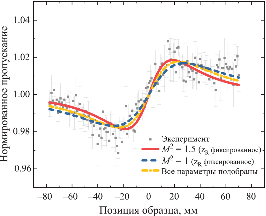 Для того чтобы найти аксиальный фазовый сдвиг в фокусе ∆Φ0, а затем по формуле (5) и n2, мы должны аппроксимировать экспериментальные данные функцией, описываемой формулой (4). Также для этого можно использовать выражение (7), связывающее ∆Φ0 с разницей между нормированными коэффициентами пропускания пика и впадины. Стоит отметить, что для интерпретации полученной зависимости мы можем использовать несколько способов. Вопервых, при аппроксимации данных можно использовать значение длины Рэлея zR, определенное при измерении каустики луча после прохождения через линзу L1 с учетом коэффициента распространения пучка M 2 = 1.5 (рис. 2). Также можно оценить длину Рэлея, исходя из предположения, что используемый пучок имеет практически гауссово распределение интенсивности в поперечном сечении, т. е. задать коэффициент M 2 равным единице, и использовать соответствующее значение zR. Другой подход − варьировать все параметры функции аппроксимации для лучшего совпадения с экспериментальной кривой. В табл. 1 показаны полученные значения для zR, ∆Φ0 и n2, определенные описанными способами. Как следует из таблицы, нелинейный показатель преломления n2 при частоте следования импульсов 1 кГц и пиковой интенсивностью 392 МВт/см2, определенный тремя способами, лежит в диапазоне от 1.63 ∙ 10-14 до 1.79 ∙ 10-14 см2/Вт, что хорошо согласуется с литературными данными [16, 17].