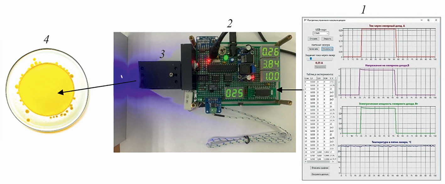 Рис. 1. Блок-схема устройства, позволяющего анализировать физико-химические параметры лазерных люминофорных систем при влиянии на них лазерного излучения с λ = 405–450 нм с разными значениями мощности и тока: 1 – общий вид приложения для управления электрическими параметрами лазерного диода; 2 – драйвер, управляющий характеристиками лазерного диода; 3 – лазерный диод с λ = 405–450 нм; 4 – система люминофор – стеклянная подложка.