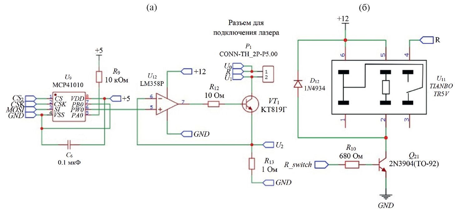 Рис. 5. Схема ограничителя тока с цифровым потенциометром (а) и выключатель лазера (б).