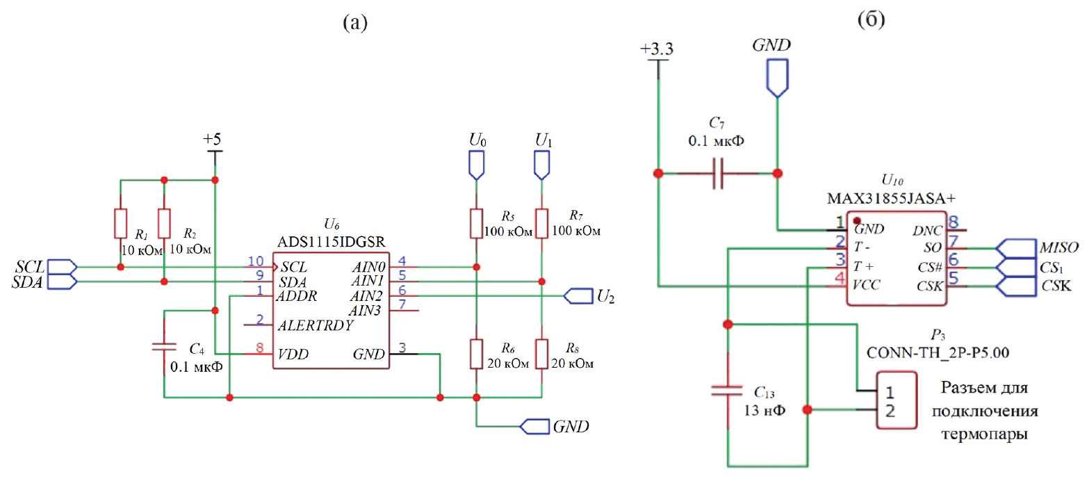 Рис. 6. Аналого-цифровой преобразователь (а) и преобразователь сигнала термопары (б).