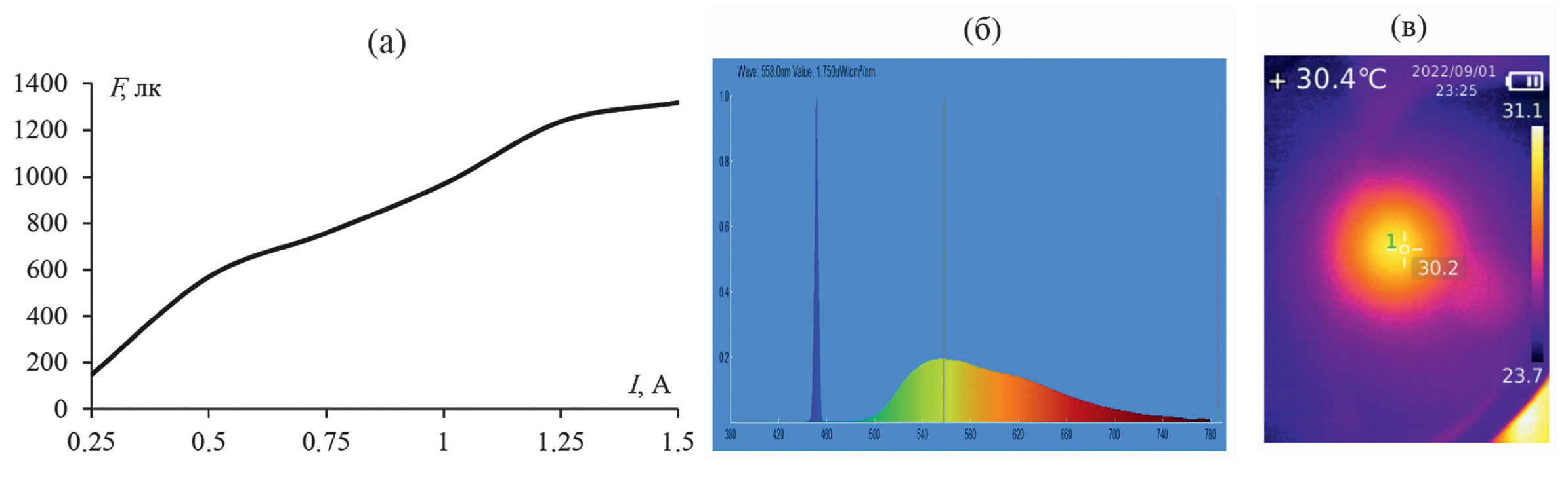 В ходе экспериментов авторы работы использовали лазерное устройство, описанное выше. С помощью него были получены численные значения светового потока в зависимости от разных значений тока и электрической мощности на образце, который представлял собой систему из люминофора и стекловидного лака. Люминофорные системы наносились на подложку из стекла, в роли которой выступала чашка Петри. На рис. 8а представлена зависимость светового потока от тока, подаваемого на лазерный диод (λ = 450 нм), для системы люминофор российского производства ЛСИД-560 – стекловидный лак – стеклянная подложка, полученная с использованием разработанного лазерного устройства (рис. 1). После генерации лазерного излучения на люминофорный образец с помощью спектрометра OHSP350 фиксировались форма спектра излучения и световой поток (рис. 8б). Использование тепловизора позволяло регистрировать тепловые поля, образующиеся при воздействии данного рода (рис. 8в).