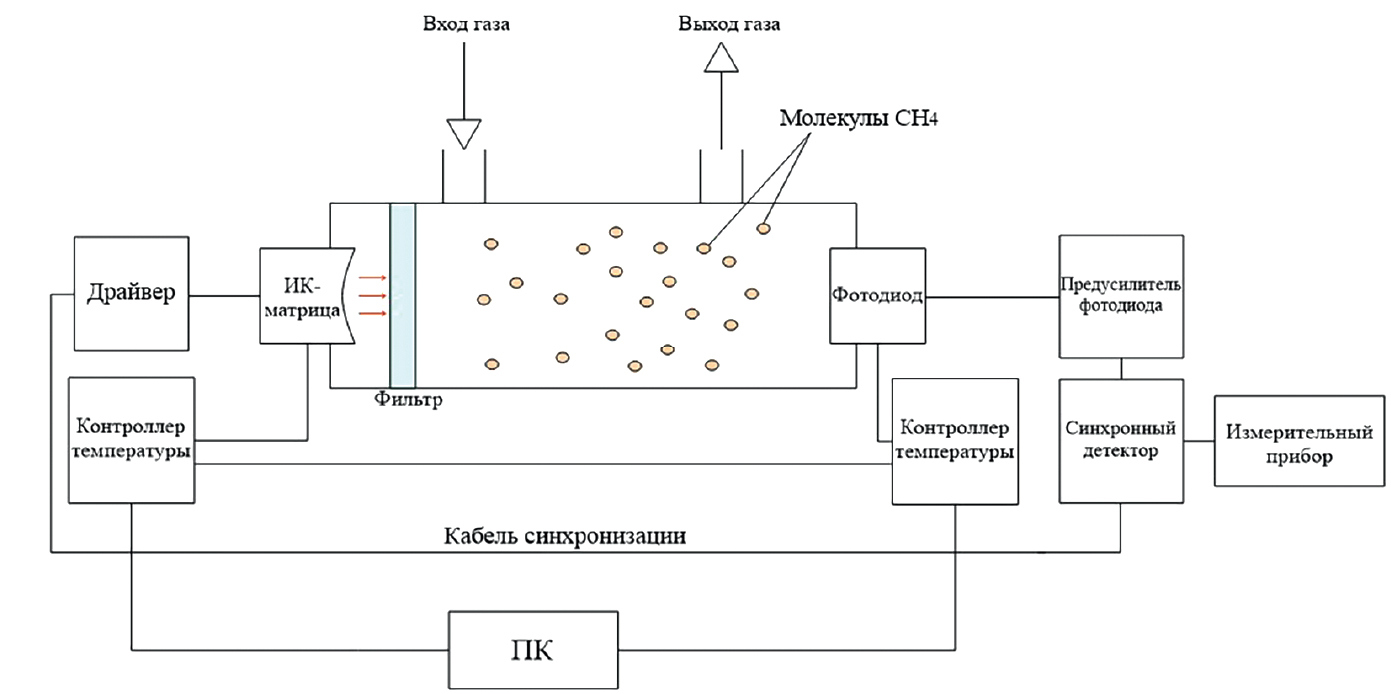 Постановка задачи заключалась в создании малогабаритного недорогого сенсора метана с чувствительностью не хуже, чем 100 ppm. Для решения поставленной задачи по совокупности параметров были выбраны свето- и фотодиоды российского производства компании ООО “ЛЕД Микросенсор НТ”. У компании ООО “ЛЕД Микросенсор НТ” имеется готовый модуль, состоящий из источника и приемника света для детекции высоких концентраций метана (выше 1000 ppm). Для увеличения интенсивности излучения была выбрана модель светодиодной четырехэлементной матрицы Lms34LED-4M-TEM-R с длиной волны 3.3–3.44 мкм. Данный прибор обладал встроенным отражателем на задней стенке, при этом матрица была установлена на элемент Пельтье. Общие параметры светодиодной матрицы показаны в табл. 1 [8]. В качестве приемника был выбран фотодиод Lms36PD-05-TEM-R в аналогичном варианте исполнения. Основные параметры фотодиода представлены в табл. 2 [8]. Общая схема прибора показана на рис. 1. Газовая кювета имеет размеры 160×36×41.5 мм3. Система сбора и анализа данных включала в себя стандартный драйвер D-51 и синхронный детектор SDM также от компании ООО “ЛЕД Микросенсор НТ”. Для контроля и поддержания температуры источника и приемника на заданном уровне мы разработали контроллеры.