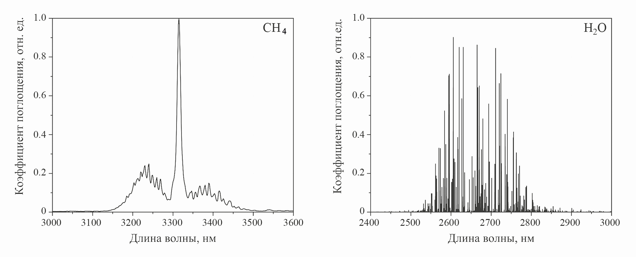 Рис. 2. Спектры поглощения метана (слева) и воды (справа).