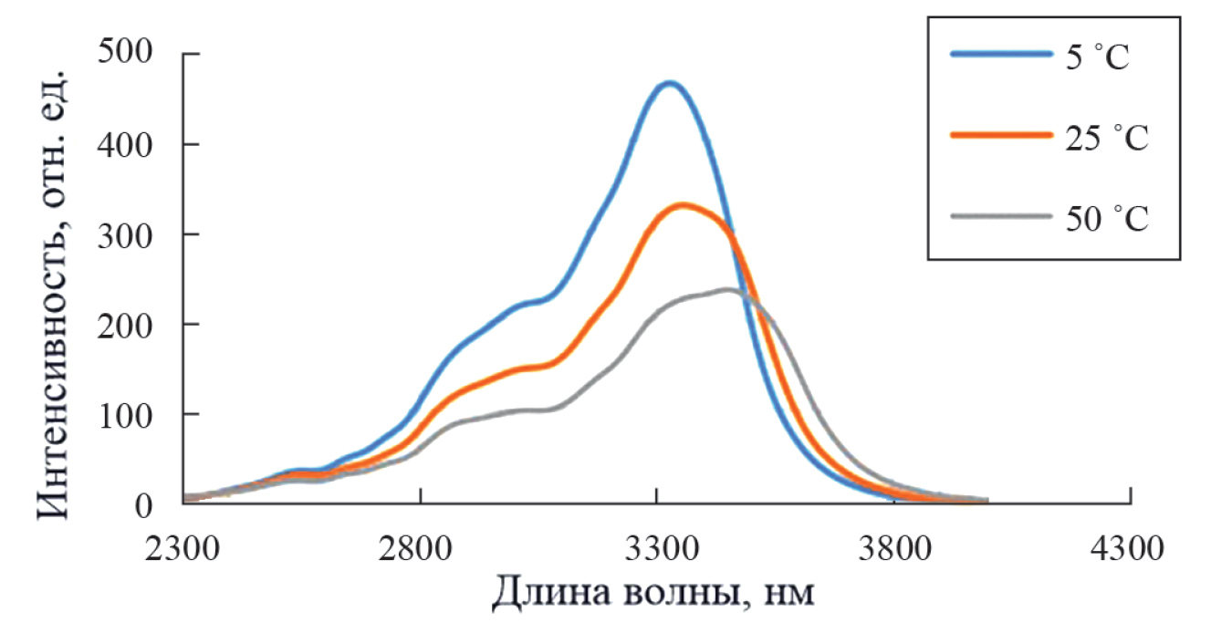 Как показано на рис. 3, с увеличением температуры спектр излучения светодиодной матрицы смещается в длинноволновую область и интенсивность излучения уменьшается. Фиксированная температура матрицы позволяет гарантировать стабильность спектра и совместить максимальную интенсивность излучения матрицы с максимумом линии поглощения метана.