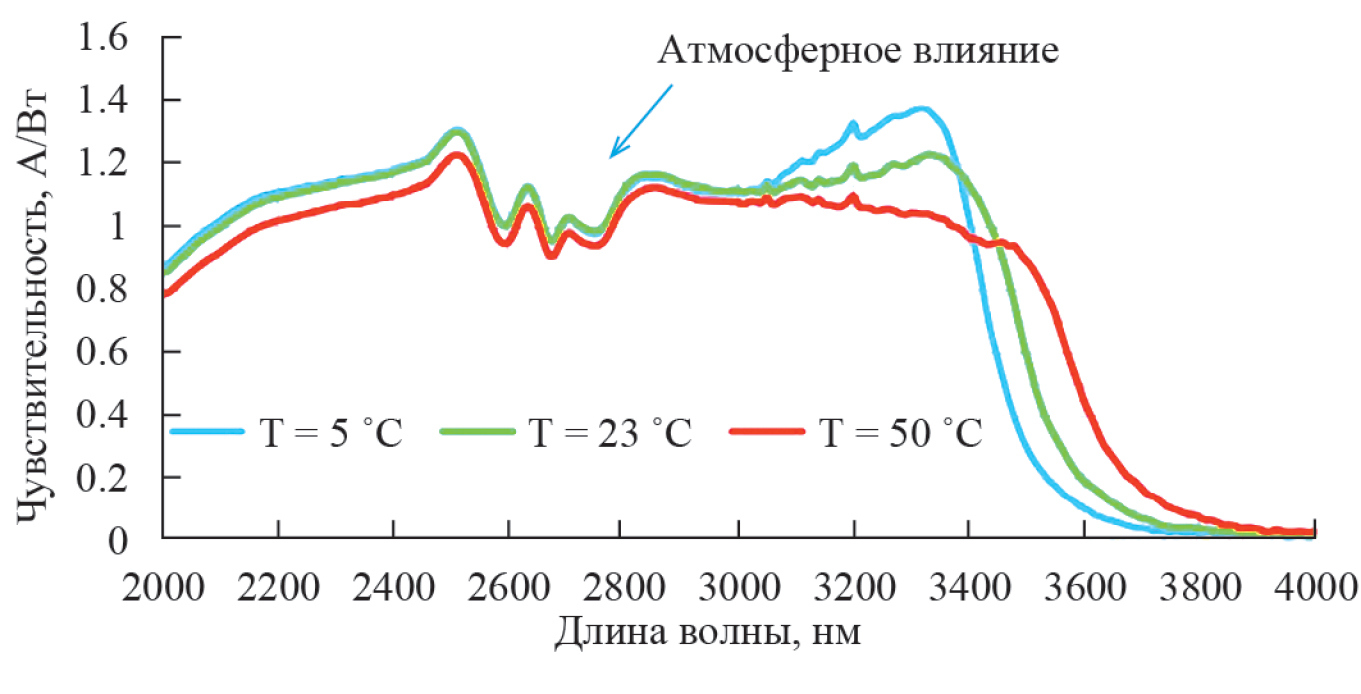 Как следует из табл. 2, фотодиод обладает максимальной чувствительности в спектральной области 2.2–3.4 мкм. В эту область попадают также спектры поглощения других газов. Зависимость чувствительности фотодиода от длины волны представлена на рис. 4.