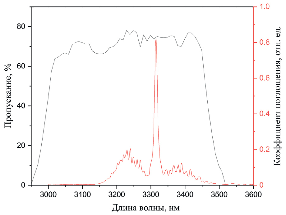 Для предотвращения влияния паров воды на детектор в схему устанавливается полосовой фильтр, который имеет центральную длину волны полосы пропускания 3250 нм. Спектр пропускания фильтра и спектр поглощения метана представлены на рис. 5. Использование полосового фильтра позволяет сократить рабочий диапазон свето- и фотодиодов от 3.0 до 3.4 мкм и заметно снизить влияние паров воды.