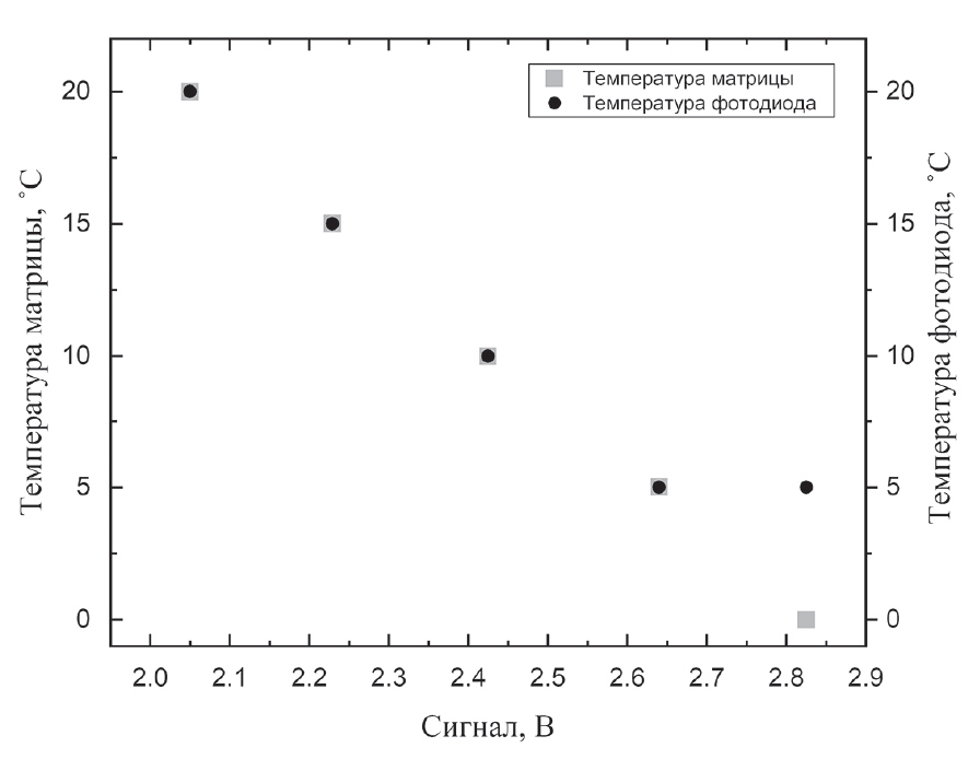 Рис. 6. Зависимость уровня выходного сигнала от температур, установленных на матрице и фотодиоде.