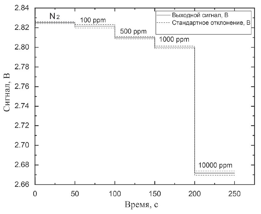 Для продувки ячейки использовался сжатый азот первого сорта, объемная доля азота не менее 99.99%. Результаты тестирования системы при различных концентрациях метана представлены в табл. 3 и на рис. 7.