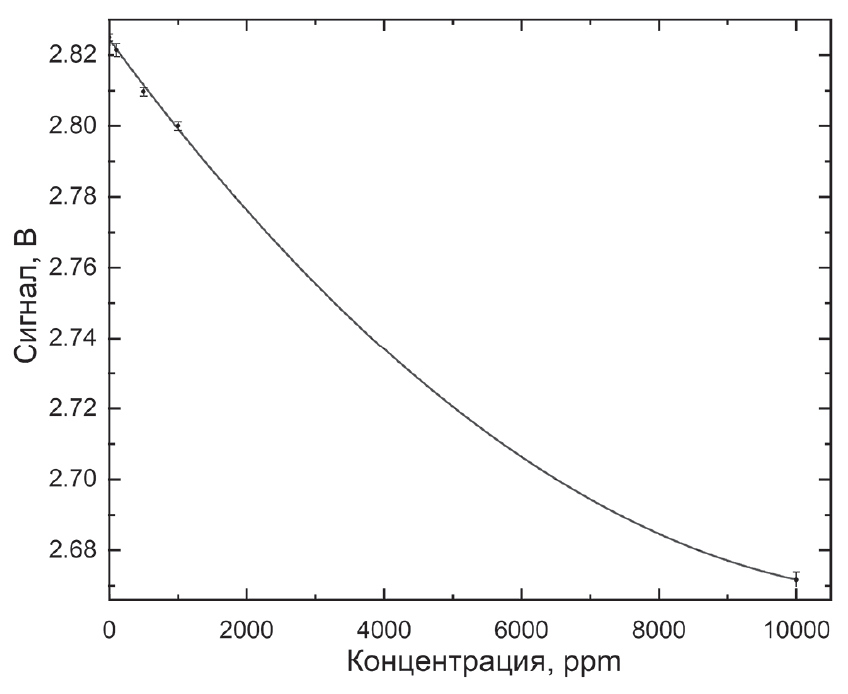 По результатам экспериментов построена зависимость уровня сигнала от концентрации метана в ячейке, представленная на рис. 8.