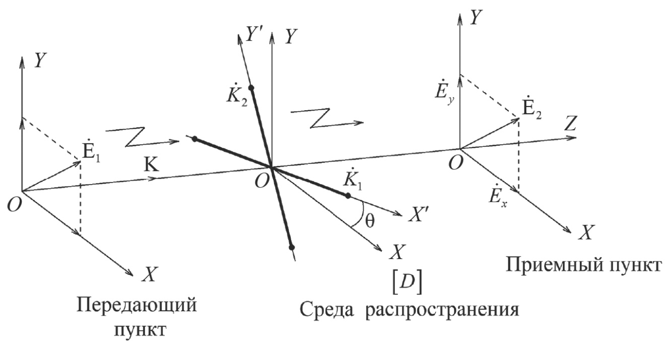 - оператор прямого перехода из опорной системы координат XOY в собственную систему координат среды распространения X’OY’, и - комплексные коэффициенты передачи, отвечающие ортам собственного базиса,