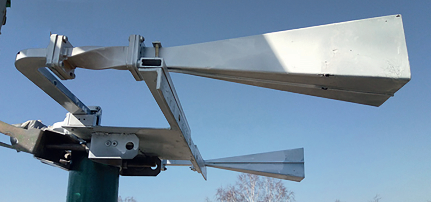 Рупорные антенны РА1 и РА2 передающего устройства были разнесены в горизонтальной плоскости на расстояние d = 0.4 м и одновременно излучали радиоимпульсы длительностью 1 мкс с частотой повторения 2 кГц на несущей частоте 9.3 ГГц. В качестве генератора сигналов (ГС) передающего устройства использовался высокочастотный Г4-83, с выхода которого СВЧ-сигналы частотой 9.3 ГГц поступали на усилитель мощности (УМ) типа М42224, работающий в импульсном режиме с коэффициентом усиления по мощности 16 дБ. Выходная мощность составила 100 мВт в импульсе. Длительность и частота повторения радиоимпульсов задавались генератором импульсов (ГИ), в качестве которого использовался стандартный генератор прямоугольных импульсов Г5-63. Электромагнитные волны с вертикальной и горизонтальной поляризациями излучались с равными амплитудами и начальными фазами. Внешний вид рупорных антенн РА1 и РА2 приведен на рис. 3. Эффективная площадь раскрытия каждой из рупорных антенн РА1 и РА2 составляла 50 см2. Ширина диаграммы направленности рупорных антенн в вертикальной плоскости по уровню половинной мощности равна 24°. Коэффициент усиления рупорных антенн составлял 18 дБ.