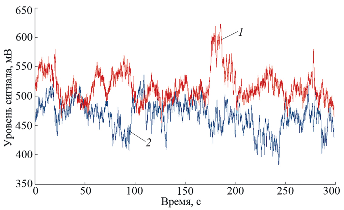 Рис. 6. Амплитуды принятых сигналов за сеанс измерений: 1 – с горизонтальной поляризацией, 2 – с вертикальной поляризацией.