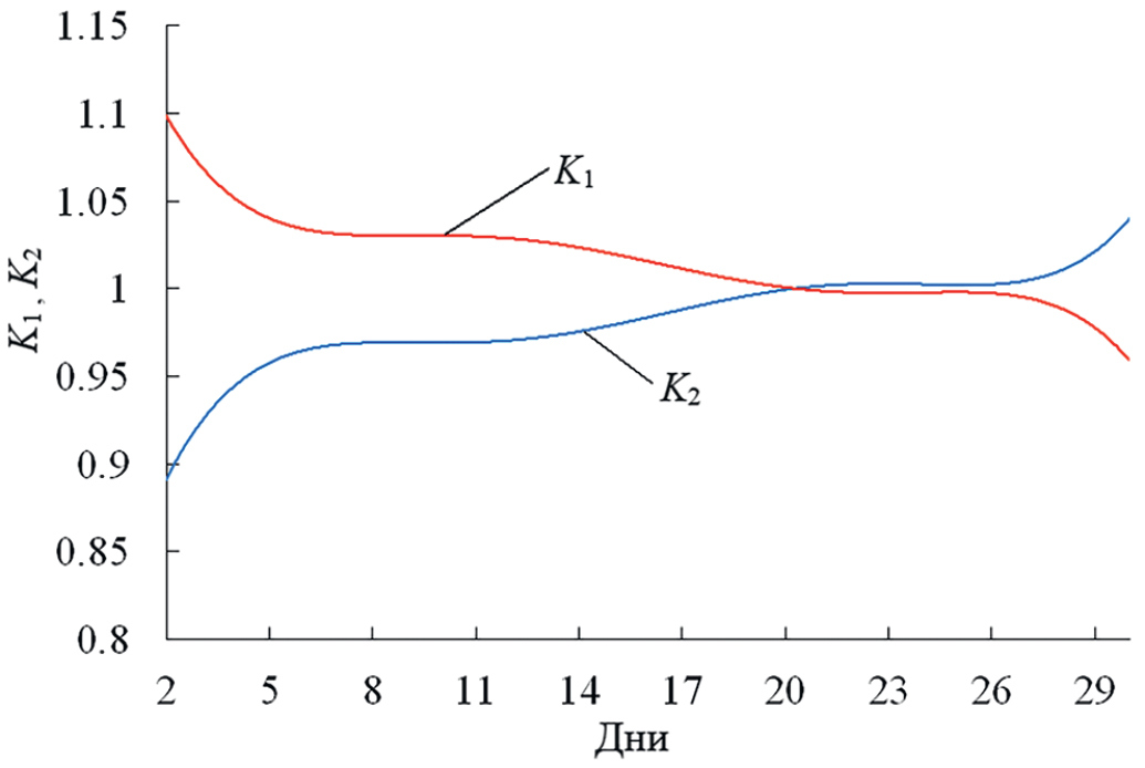 На рис. 8 приведены экспериментальные зависимости среднего уровня принятых сигналов с горизонтальной и вертикальной поляризациями за весь период измерений, а на рис. 9 - рассчитанные средние значения параметров K1 и K2 двухвибраторной модели рассеяния электромагнитных волн, при которых эти экспериментальные зависимости подтверждаются. Действительно, например, когда в период времени с 20 по 26 января средние значения рассчитанных коэффициентов передач двухвибраторной модели сравнимы, т.е. K1 ≈ K2 ≈ 1, тогда и средние значения амплитуд принятых ортогонально-поляризованных сигналов также сравнимы, Ex ≈ Ey. Параметры K1 и K2 рассчитывались по формулам (23), (24) с учетом принятой единичной интенсивности волны для случая q = 0, когда собственная система координат среды распространения совпадает с опорной XOY.