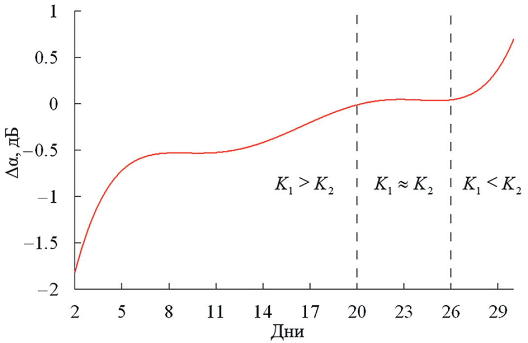 На рис. 10 приведена экспериментальная зависимость средних значений дифференциального амплитудного ослабления Δα за весь период измерений. Вертикальными штриховыми линиями обозначены границы временных интервалов измерений Δα для различных соотношений параметров K1 и K2 двухвибраторной модели рассеяния электромагнитных волн. Соотношение параметров модели, когда K1 > K2, соответствует отрицательным значениям дифференциального амплитудного ослабления Δα < 0. При K1≈K2 ≈1 ослабление отсутствует, т.е. Δα≈0. Когда K1 < K2, ослабление принимает положительные значения: Δα > 0.
