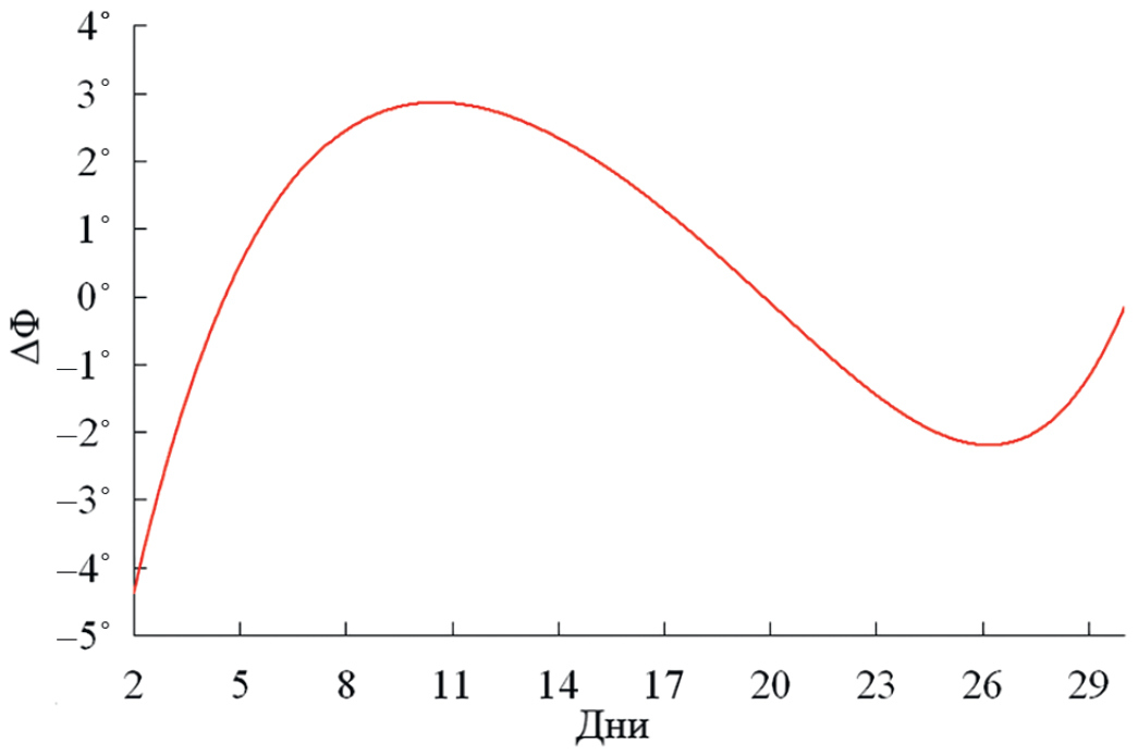 На рис. 11 приведена экспериментальная зависимость средних значений дифференциального фазового сдвига за весь период измерений. Видим, что средние значения разности фаз принятых ортогонально-поляризованных сигналов изменялись в пределах от -5° до +3°. Анализ зависимости подтверждает наличие анизотропии в среде распространения за весь период измерений, за исключением только одного дня - 20 января, когда среда распространения была близка к изотропной, так как в этот день наблюдались следующие параметры: K1 = K2 = 1 и .