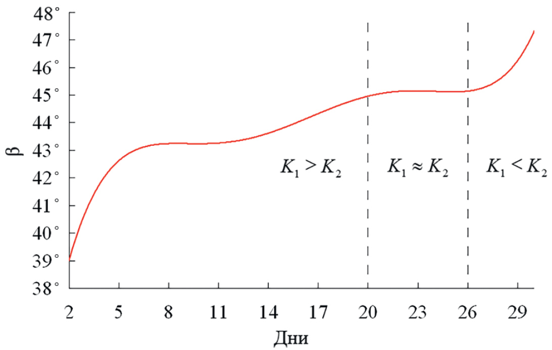 Рис. 13. Средние значения угла ориентации эллипса поляризации β за весь период измерений: K1 > K2 соответствует значениям β < 45°, при K1 ≈ K2 ≈ 1 угол ориентации β ≈ 45°, когда K1<K2, угол ориентации β > 45°.