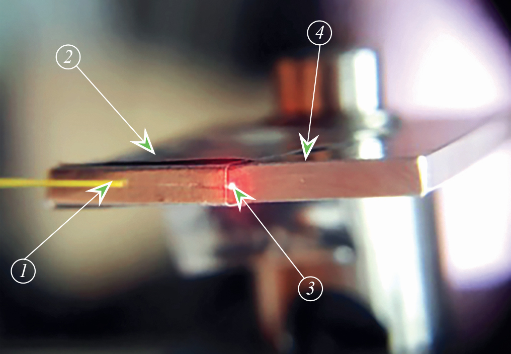 Рис. 2. Закрепление и проверка оптического волокна в держателе для полировки: 1 – оптическое волокно, 2 – подготовленная липкая поверхность на держателе 4, 3 – выходящее для проверки излучение.